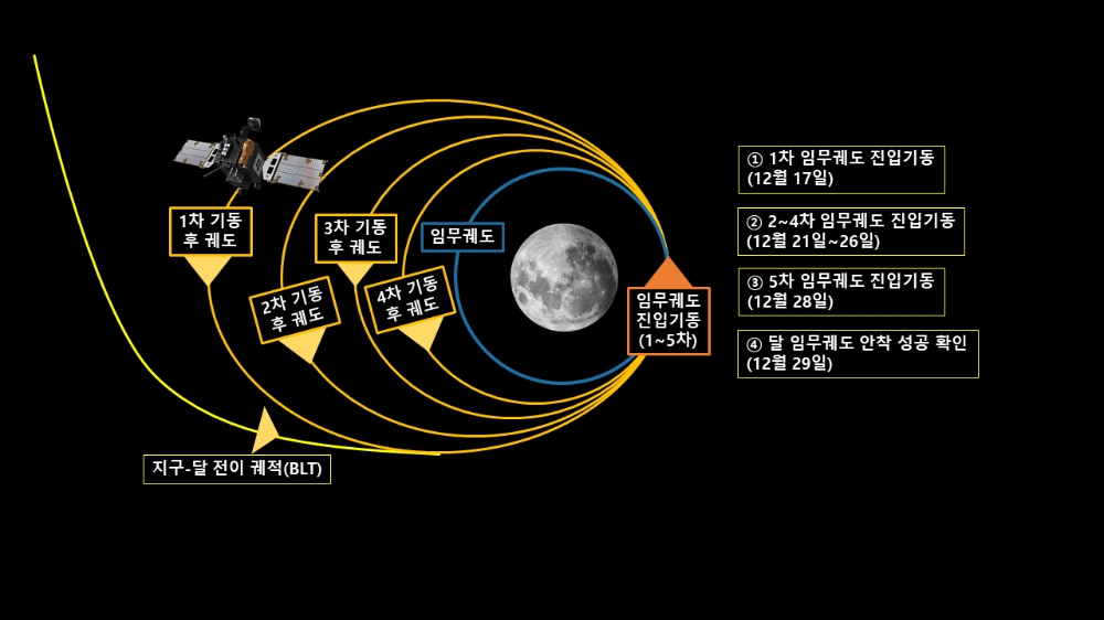 다누리는 8월 5일 발사 후 약 4개월반 동안 지구-달 전이 궤적을 따라 총 594만㎞를 비행했고 17일 달에서 약 108㎞ 거리까지 근접한다.