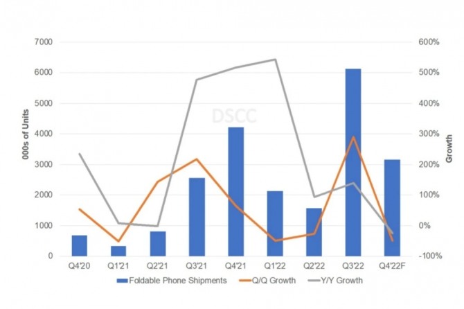 이미지 확대보기폰아레나는 16일(현지시간)시장조사업체 DSCC의 보고서를 인용해 폴더블폰 출하량 전년 동기 대비 25%, 전분기 대비 48% 감소했다고 보도했다. 이에 따라 폴더블폰 출하량은 3분기 610만대에서 4분기 310만대로 줄었다.