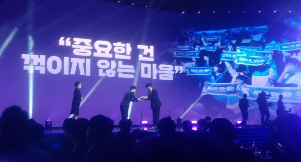 이날 시상식에는 인터뷰를 진행한 문대찬 기자가 시상자로 나섰다. 김혁규 선수는 "프로 생활이 쉽지 않았는데, 월드 챔피언십 우승을 하고 나니 그 커리어가 더욱 빛났던 것 같다"며 "힘든 시간을 보내고 계신 모든 분들에게 나보다 더욱 빛나는 시간이 오길 기원한다"고 수상 소감을 밝혔다.