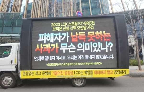 이미지 확대보기LOL파크가 위치한 서울시 종로구 소재 그랑서울 앞에는 이날 LCK 소속팀 '브리온' 팬들의 명의로 전광판 트럭이 배치됐다. 전광판에는 올 초 진영 선택 오전달 사건을 문제 삼으며 '존중 없는 리그 운영', '기울어진 공정성'을 개선할 것을 촉구하는 내용이 담겨 있었다.