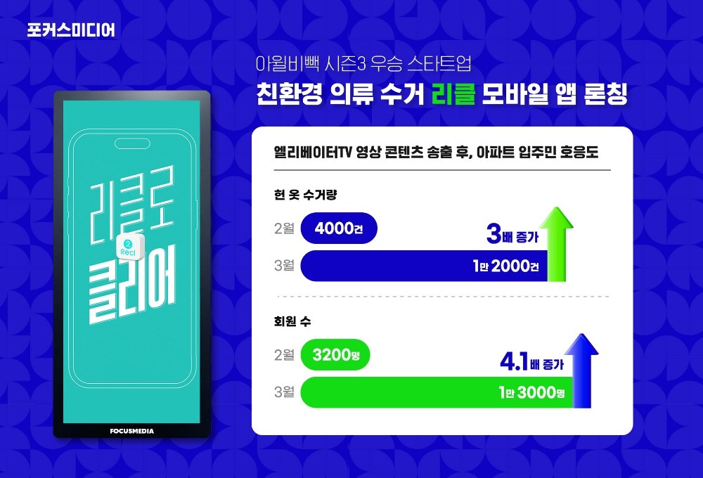 포커스미디어코리아는 지난 3월 리클 앱 오픈베타 출시에 맞춰 리클 서비스를 소개하는 엘리베이터TV 영상 콘텐츠를 제작해 한 달 동안 송출한 결과, 수거량은 4000건에서 1만2000건으로 3배 많아지고 회원 수는 3200명에서 1만3000명으로 4.1배 증가하는 등 아파트 입주민으로부터 큰 호응을 얻고 있다.