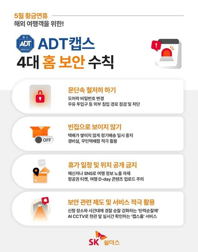 SK쉴더스 관계자는 “5월 황금연휴를 앞두고 해외여행 등 장기간 외출을 계획하는 이들이 늘면서 빈집을 노리는 주거 범죄가 기승을 부릴 것으로 예상된다”며 “해외에 있을 경우 사건사고에 대한 신속한 대응이 어려운 만큼 외출 전 ADT캡스 4대 홈 보안 수칙을 참고해 홈 보안에 신중을 기할 것을 당부한다”고 전했다.