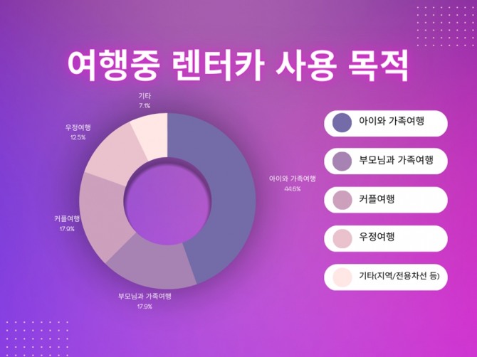이미지 확대보기티맵모빌리티는 TMAP 렌터카 서비스 이용객 3696명을 대상으로 설문조사를 진행한 결과 44.6%가 '아이와 함께 가족 여행'을 목적으로 꼽았다고 2일 밝혔다. '부모님과의 여행', '우정 여행'이 17.9%로 공동 2위, 커플여행(12.5%)이 뒤를 이었다.