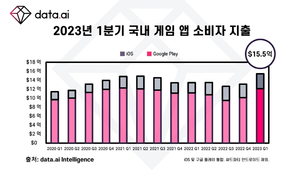 이미지 확대보기데이터는 올해 1분기는 대한민국 모바일 시장이 경기 침체로부터 벗어났음을 보여주며, 비게임과 게임 부문에서 지난 분기 대비 소비자 지출과 다운로드 모두 성장하는 모습을 보여주고 있다. 이 중 게임 앱의 경우, 이번 분기에 약 15.5억 달러(2조원)의 소비자 지출을 달성해 분기별 소비자 지출에서 전례 없는 신기록을 기록했다. 이는 전년 대비 15%, 지난 4분기 대비 18% 상승한 셈이다.