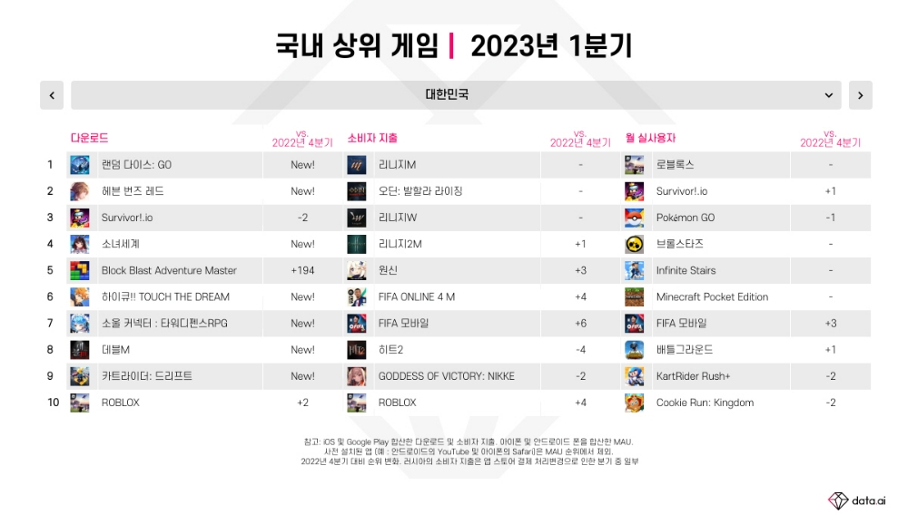 국내 게임 앱 소비자 지출이 이번 분기 신기록을 세울 수 있었던 배경에는 기존 리니지 3대장(리니지M, 리니지W, 리니지2M)이 상위권에서 굳건한 위치를 고수한 것에 더해 신작 게임들이 상위권 차트에 안착한 것이 큰 몫을 했다. 지난 하반기 출시한 시프트업의 '승리의 여신: 니케', 넥슨게임즈의 '히트2' 등의 신작이 국내에서 꾸준히 인기몰이를 하며 타 인기작들과 함께 모바일 시장에 크게 기여하고 있다.