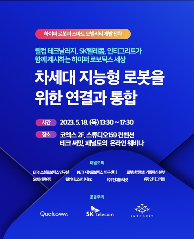 인티그리트, SK텔레콤, 퀄컴 테크날러지 3사는 공동으로 ‘차세대 지능형 로봇을 위한 연결과 통합’이라는 주제로 오는 18일 코엑스 스튜디오159에서 ‘테크서밋’ 세미나와 함께 온라인 ‘웨비나’ 행사를 개최한다고 16일 밝혔다. 행사는 로봇 업계 다양한 전문가들과 함께 참여하는 패널 토의를 통해 향후 로봇 간 연결성을 강화해 데이터를 공유하고 처리할 수 있는 규격과 운영방안 등을 논의한다. 또한, 모든 국내 기업들이 규격화에 참여할 수 있는 열린 포럼을 발의하여, 국내 로봇 기술과 규격을 통하여 국제표준화를 주도할 수 있는 계기를 만들어 간다는 계획이다.