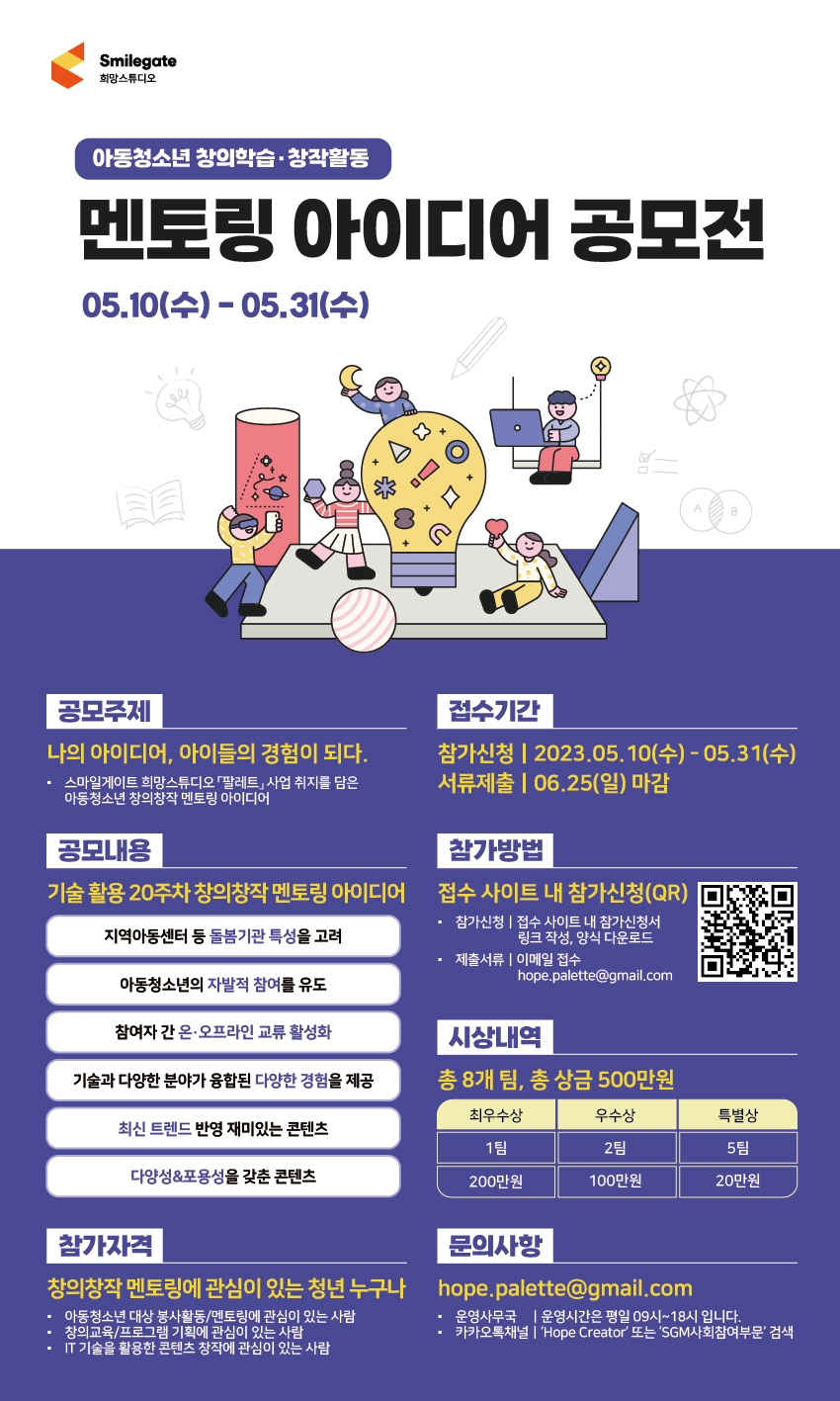 공모전 심사는 창의 교육 전문가와 사회복지 전문가 등 전문 평가위원이 맡는다. 스마일게이트 희망스튜디오에서 운영하는 창의/창작 저변 확대 프로그램인 ‘팔레트’와의 연관성, 창의성, 완성도 등을 종합적으로 평가할 예정이다. 공모전 최우수팀에게는 상금 200만원(1개 팀), 우수팀에게는 상금 100만원(2개팀), 특별팀에게는 20만원(5개팀)이 지급된다.