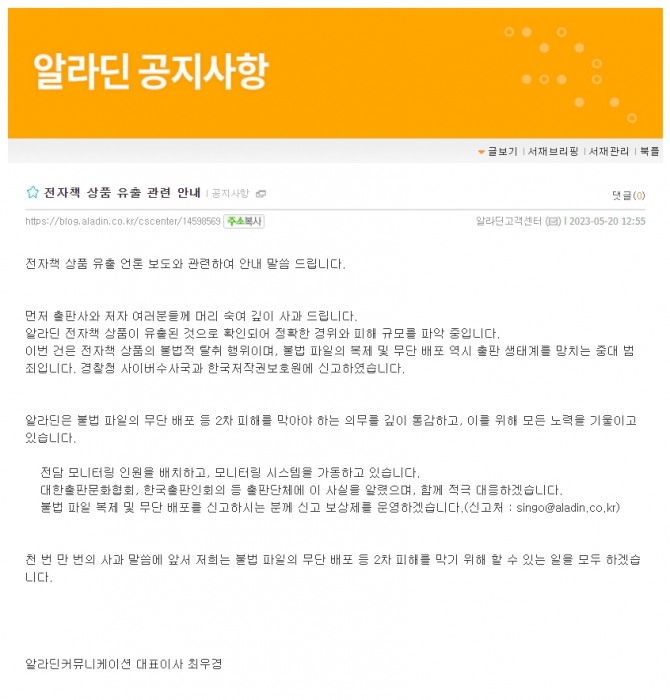 알라딘은 공지사항을 통해 "알라딘 전자책 상품이 유출된 것으로 확인되어 정확한 경위와 피해 규모를 파악 중"이라며 "이번 건은 전자책 상품의 불법적 탈취 행위이며, 불법 파일의 복제 및 무단 배포 역시 출판 생태계를 망치는 중대 범죄다"라고 강조했다.