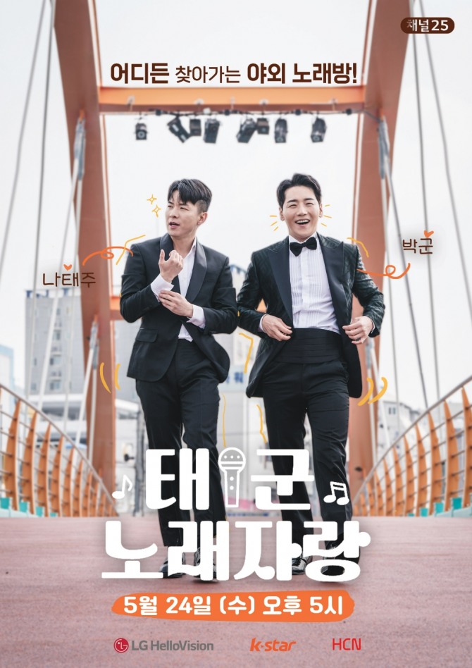 이미지 확대보기LG헬로비전은 K-STAR, HCN과 함께 기획∙제작한 신규 오리지널 예능 '태군노래자랑'이 24일 저녁 5시에 지역채널 25번에서 첫 방송한다고 밝혔다. '태군노래자랑'은 트로트 가수 나태주와 박군이 노래방 기계를 들고 전국 방방곡곡을 찾아가 진행하는 로컬 노래자랑 프로그램이다. 노래 실력이 부족해도, 춤 실력이 충분치 않아도 오직 노래방 기계 점수 결과에 따라 상품과 상금을 받아 갈 수 있다.