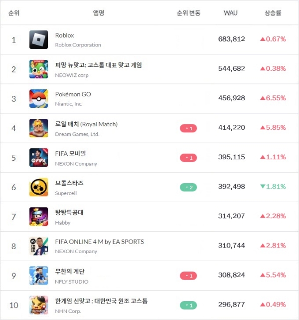 이용자 수 최상위권 게임 대부분이 소폭 상승세를 보인 가운데 로얄 매치 외에도 넥슨 '피파 모바일'과 카카오게임즈 관계사 넵튠의 '무한의 계단'이 각각 순위가 하나씩 올랐다. 브롤스타즈는 톱10 게임 중 유일하게 전주 대비 이용자 수 하락세를 보였다.