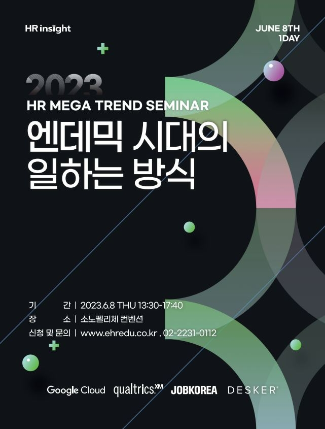 이미지 확대보기이번 2023 HR MEGA TREND 세미나는 기업 인사담당자 대상 '엔데믹 시대의 일하는 방식'을 주제로 진행될 예정이다. 중앙경제HR이 주관하며, 잡코리아 외 구글클라우드, 퀼트릭스, 데스커가 스폰서사로 참여한다.