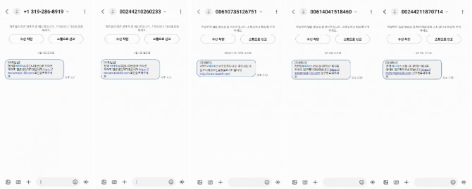 이미지 확대보기2일, 5일 양일에 걸쳐 복수의 피싱 의심 문자메시지가 다수 수신됐다. 기자 본인 또한 관련 메시지를 몇 차례 수신했고, 각종 가상자산 관련 SNS에서도 같은 문자를 받았다는 이들이 다수 등장했다.