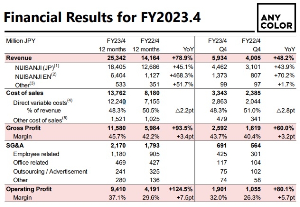 이와 별개로 중국의 동영상 플랫폼 빌리빌리와 합작한 '버추아리얼'에서 총 47명의 버튜버를 운영하고 있다. 버추아리얼 매출을 포함한 기타 매출은 5억엔(약 48억원)으로 전체 매출의 2.1%를 차지했다.