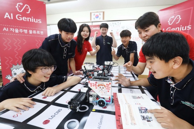 이미지 확대보기AI 물류로봇 수업은 LG CNS가 고객사의 빠르고 정확한 배송을 위해 도심물류센터 MFC(Micro Fulfillment Center)에 적용하고 있는 핵심 DX 기술을 체험하는 시간이다. 학생들은 AGV(Automated Guided Vehicle), 스마트소터 등 물류로봇과 AI 카메라에 직접 AI 코딩 작업을 수행해 작동시켰다.