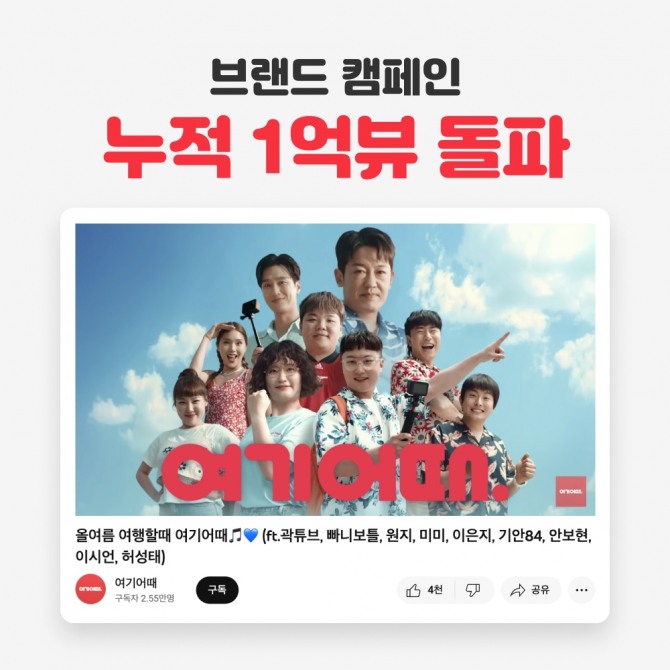 실제 2021년 첫 선을 보인 '여기어때 송' 캠페인의 유튜브 영상은 20일 기준 총 1억800만뷰를 기록했다.