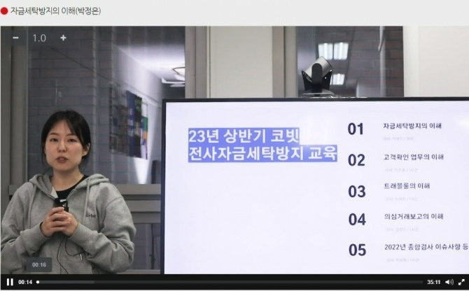 이미지 확대보기이를 위해 코빗은 이달 초 준법감시인과 자금세탁방지센터장을 비롯한 해당 업무 담당자들이 준비한 커리큘럼으로 직접 강의하는 장면을 동영상으로 미리 촬영했다. △자금세탁방지 의무 전반 △고객확인제도 △트래블룰 △의심거래보고 △임직원이 지켜야 할 내부통제 의무에 이르기까지 각자 한 가지 주제를 맡아서 코빗 실무에 특화된 내용을 담아 강의를 진행했다. 이렇게 촬영된 동영상 강의는 온라인 교육 플랫폼을 통해서 지난 19일부터 일주일간 코빗 임직원 전체가 이수했다.