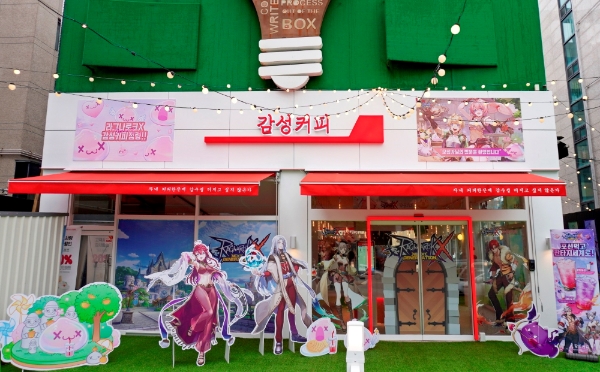 이미지 확대보기서울 송파구 소재 감성커피 테라스에선 5일 오전 10시 '라그나로크X' 테마 카페가 열렸다. 매장 내외가 게임 속 캐릭터들의 입간판과 테마 이미지 등으로 꾸며졌으며 '힐링포션', '마나포션' 등 한정판 메뉴가 판매되고 있다.