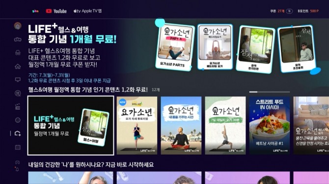 우선 'LIFE+다큐&아트' 월정액은 예술을 포함한 전반적인 분야에 교양을 쌓고 싶은 고객을 위해 <베어그릴스의 인간과 자연 대결>, <레전더리 콘서트> 등 시사교양, 다큐, 범죄, 추리, 클래식까지 폭넓은 콘텐츠를 제공한다. 'LIFE+헬스&여행' 월정액은 홈트족과 여행을 좋아하는 고객을 위해 <요가소년: 내 몸을 가꾸는 시간>, <다시 갈 지도> 등 홈트레이닝, 취미 운동, 국내외 세계여행 예능을 포함한 다양한 힐링 콘텐츠를 제공한다.