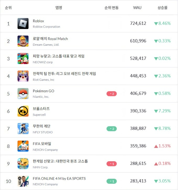 구글 플레이스토어 8월 4주차 WAU 톱10 게임 중 가장 높은 수익을 거둔 것은 같은 기간 매출 9위를 기록한 피파 모바일이었다. 그 외에도 로얄 매치가 13위, 로블록스가 15위, 피파 온라인 4M이 29위를 기록했다.