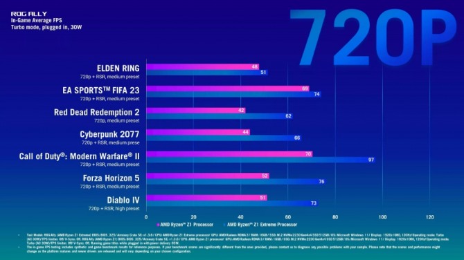 720p 해상도로 설정했을 때는 프레임 차이가 많이 좁혀졌다. 엘든링의 경우 Z1이 48fps인 반면, Z1 익스트림은 51fps에 그쳤다. EA스포츠의 '피파23'도 69, 74fps로 큰 차이를 보이지 않았다.