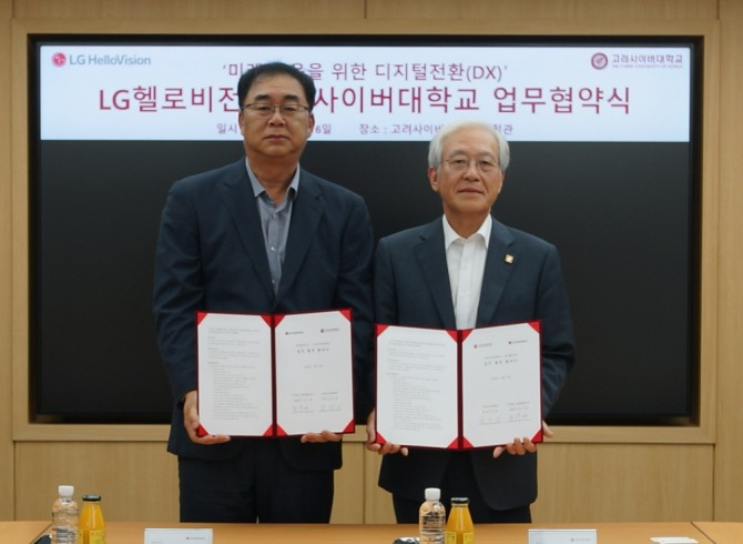 이미지 확대보기LG헬로비전과 고려사이버대학교는 '미래 교육을 위한 디지털전환(DX)' 산학협력 업무협약(MOU)을 체결했다고 10일 밝혔다. 협약식은 LG헬로비전 송구영 대표이사, 고려사이버대 김진성 총장 등 주요 관계자들이 참석한 가운데 고려사이버대 화정관에서 지난 6일 진행됐다.