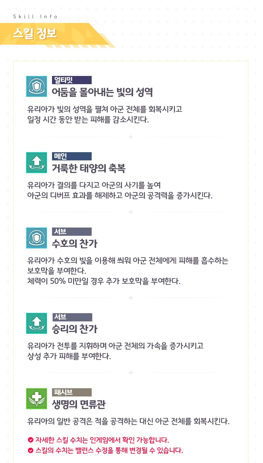 서브스킬인 '수호의 찬가'는 모든 아군에게 14초 동안 유리아 공격력의 140%까지 피해를 흡수하는 보호막 부여한다. 해당 보호막은 적의 디버프 스킬의 영향을 받지 않는다.