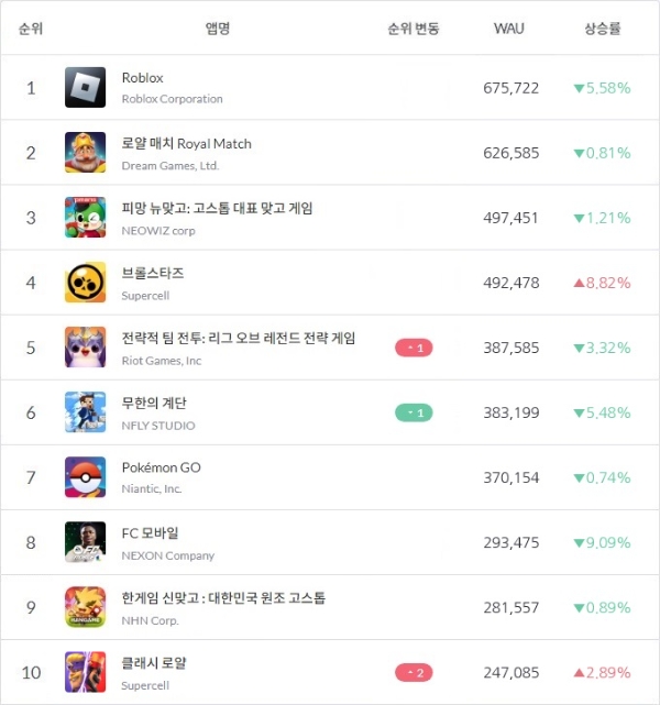 '로블록스'와 '로얄 매치', '피망 뉴맞고' 등이 톱3를 지킨 가운데 라이엇 게임즈의 '전략적 팀 전투(TFT)'와 넵튠 '무한의 계단'이 5위 자리를 두고 순위 다툼을 벌이고 있다.
