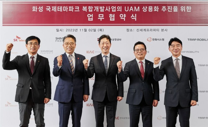 티맵모빌리티·한국공항공사·한화시스템·SKT, 신세계프라퍼티와 UAM 상용화 협약 체결