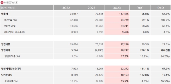 이미지 확대보기공시에 따르면 네오위즈는 올 3분기 연결 기준 잠정 실적으로 매출 1174억원, 영업이익 202억원, 당기순이익 181억원을 기록했다. 2022년 3분기 대비 매출 56.8%, 영업이익은 3배 이상 증가했으며 직전 분기와 비교하면 영업흑자로 전환했다.