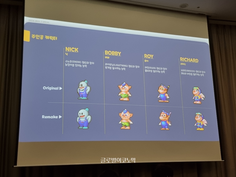 이미지 확대보기다음으로 소개된 게임은 스노우 브라더스2 스페셜이다. 이 게임은 닌텐도 스위치와 PC 버전으로 출시된다. 기 출시됐던 스노우 브라더스 IP 게임과 달리 그래픽도 한층 고해상도로 바뀌었고 스노우맨 '닉' 외에 '로이', '바비', '리차드' 등 신규 캐릭터가 추가됐고, 캐릭터마다 스킬도 달라 전략적인 요소도 강화됐다.