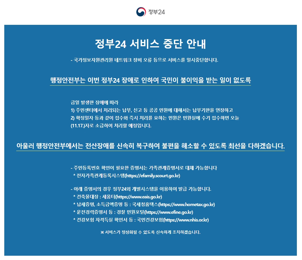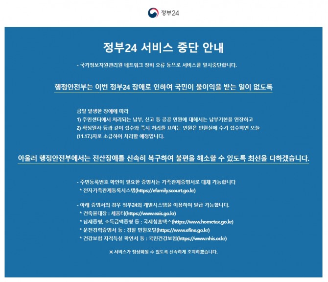 이미지 확대보기행정안전부는 17일 공무원 전용 행정전산망인 '새올'의 장애로 인해 지자체 민원실과 온라인 민원서비스인 '정부24'의 업무처리가 지연됨에 따라 불이익을 당하는 국민이 없도록 조치할 예정이라고 밝혔다. 행안부는 행정절차법에 따라 주민센터에서 처리되는 납부, 신고 등 공공 민원에 대해서는 납부 기한을 장애가 복구돼 납부할 수 있는 시점까지 연장한다고 덧붙였다.