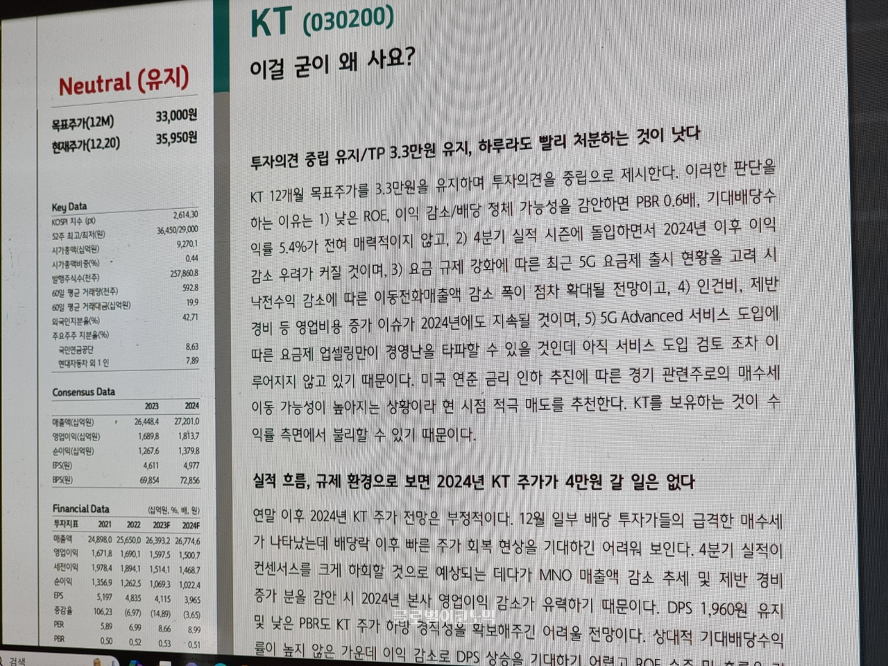 이에 하나은행 김홍식 연구원은 21일 기업 분석 리포트에서 KT 주식에 대해 "이걸 굳이 왜 사요?"라는 제목을 달았다. 투자의견은 '중립'이지만 보고서에 "△낮은 ROE, 이익 감소/배당 정체 가능성을 감안하면 PBR 0.6배, 기대배당수익률 5.4%가 전혀 매력적이지 않고, △4분기 실적 시즌에 돌입하면서 2024년 이후 이익 감소 우려가 커질 것이며, △요금 규제 강화에 따른 최근 5G 요금제 출시 현황을 고려 시 낙전수익 감소에 따른 이동전화매출액 감소 폭이 점차 확대될 전망이고, △인건비, 제반 경비 등 영업비용 증가 이슈가 2024년에도 지속될 것이며, △5G Advanced 서비스 도입에 따른 요금제 업셀링만이 경영난을 타파할 수 있을 것인데 아직 서비스 도입 검토 조차 이루어지지 않고 있기 때문"이라면서 "(KT 주식을) 하루라도 빨리 처분하는 것이 낫다"고 직격탄을 날렸다.