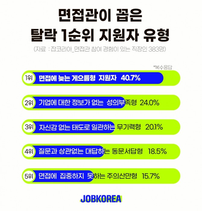 잡코리아는 먼저, 설문에 참여한 면접관들에게 면접 지원자 중 최악으로 생각하는 유형이 무엇인지 꼽아보게 했다. 그 결과, 면접에 늦는 '게으름형 지원자'가 응답률 40.7%로 1위에 올랐다. 다음으로 △지원한 기업에 대한 정보가 부족한 성의부족형 지원자(24.0%) △자신감 없는 무기력형 지원자(20.1%)가 각 2위와 3위를 차지했다.