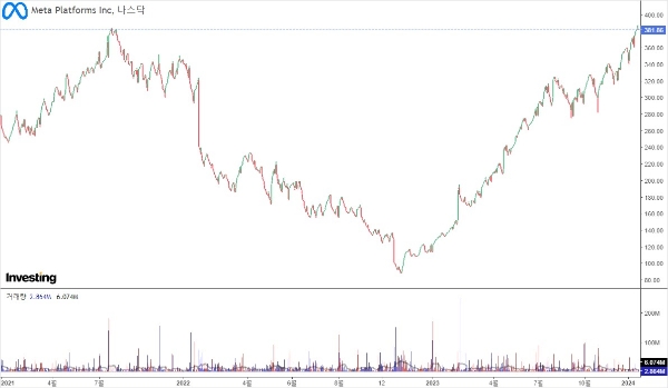이미지 확대보기나스닥에 상장된 메타의 주식 거래가는 현지 시각 22일 최고 390.35달러(약 52만원)을 기록, 종가 381.78달러로 마무리됐다. 2021년 9월 1일 기록한 기존 최고가 384.33달러를 갱신했다.