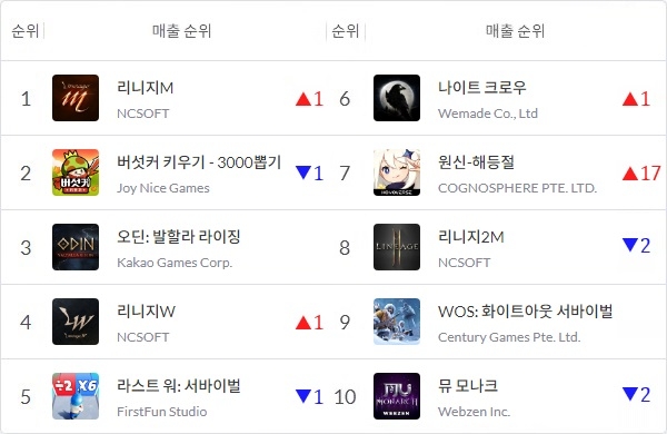지난해 11월 이후 '원신', '오딘', '버섯커'와 1위 다툼