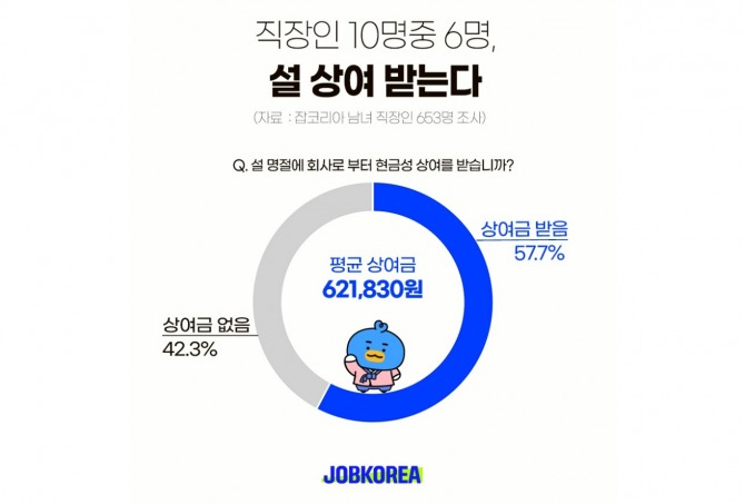 이미지 확대보기메타 커리어 플랫폼 잡코리아가 최근 남녀 직장인 653명을 대상으로 '설 상여금 지급 유무'에 관한 설문조사를 실시하고 그 결과를 발표했다. 잡코리아 자료에 따르면, 설문에 참여한 직장인들 중 57.7%가 '회사로부터 설 상여금을 지급받는다'고 답했다. 이들이 밝힌 상여금 액수는 평균 62만1830원인 것으로 집계됐다.