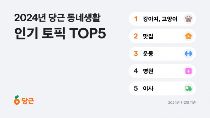 3위에 오른 키워드는 ‘운동’이다. 자기 관리에 대한 관심이 높아지는 연초를 맞아 집 근처 헬스장이나 요가 학원 정보를 공유하는 움직임으로 분석된다. 이밖에 치과, 피부과, 이비인후과 등 동네 곳곳에 있는 병원들의 생생한 진료 후기와 운영 시간, 예약 방법 등 다양한 정보가 공유되는 '병원' 키워드가 4위에 올랐다. 5위는 포장이사, 입주 청소, 이삿짐센터 등을 물어보는 '이사' 관련 정보가 차지했다.