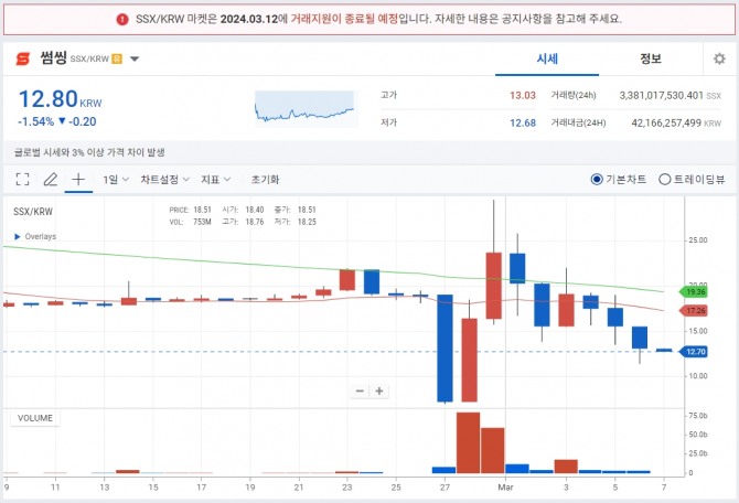 이후 국내 5대 원화마켓 거래소 협의체 닥사(DAXA)가 썸씽 코인을 거래 유의종목으로 지정했다. 썸씽 재단 측은 닥사에 소명자료를 제출하고 후속 대처를 했지만 닥사는 이것이 투자유의종목 지정 사유 해소에 불충분하다고 판단, 2월 27일에 국내 원화마켓 거래소에서 썸씽 코인을 거래지원 종료(상장폐지)한다고 밝혔다. 거래소에서 완전히 거래가 중단되는 시점은 3월 12일이다.