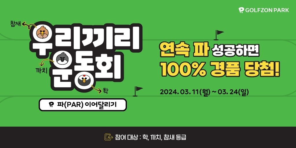 이미지 확대보기골프존파크 '우리끼리 운동회' 이벤트는 봄철 본격적인 라운드 시즌에 스크린골프를 통해 국내외 다양한 코스의 라운드를 간편하게 즐길 수 있도록 마련됐다. 이벤트는 세 가지로 구성됐으며 학, 까치, 참새 등급 회원이라면 투비전, 투비전NX 시뮬레이터가 설치된 전국 골프존파크 매장에서 스트로크 모드로 누구나 참여할 수 있다.