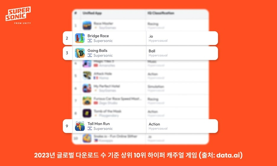 2023년 전 세계 모바일 게임 다운로드 순위 100위 게임 중 유니티 슈퍼소닉의 게임은 △브릿지 레이스(Bridge Race) △고잉 볼즈(Going Balls) △톨 맨 런(Tall Man Run) △이모지 퍼즐(Emoji Puzzle) △빌드 어 퀸(Build a Queen) △슬로우 모 런(Slow Mo Run) △하이드 앤 시크(Hide ‘N Seek) 등 총 7편에 달하며, 하이퍼 캐주얼 포함 전체 게임 장르 기준으로 브릿지 레이스는 전체 11위, 고잉 볼즈는 12위를 차지했다.