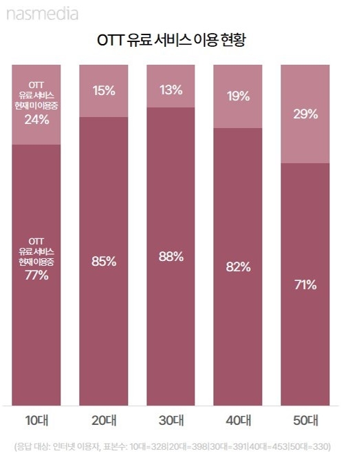이미지 확대보기KT그룹의 디지털 마케팅 기업 나스미디어가 15일 발간한 '2024 인터넷 이용자 조사 보고서(NPR)'에 따르면 10대부터 50대까지를 아우르는 70% 이상의 이용자가 OTT 서비스를 이용하는 것으로 나타났다.