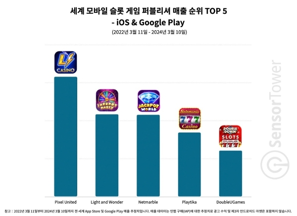 이미지 확대보기앱 통계 분석 플랫폼 센서타워에 따르면 넷마블은 2022년 3월부터 2024년 3월까지 2년간의 누적 매출 기준 3위에 올랐다. 이는 호주 카지노 전문사 아리스토 크랫의 모바일 게임 브랜드 '픽셀 유나이티드', 미국 현지 소셜 카지노 전문사 라이트 앤 원더 등 영미권 전문 업체들 다음 가는 성과였다.