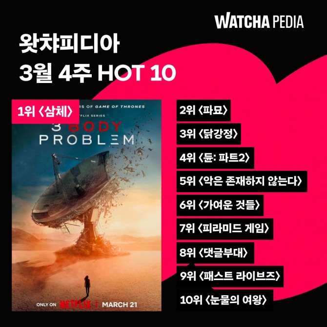 3월 4주차(3월 21일~27일) 기준, 왓챠피디아 HOT 10 랭킹 1위는 넷플릭스 오리지널 시리즈 '삼체'가 차지했다. '삼체'는 3월 21일 공개 직후 왓챠피디아 내 검색량과 보고싶어요 순위가 급상승하며 1위 콘텐츠로 등극했다.