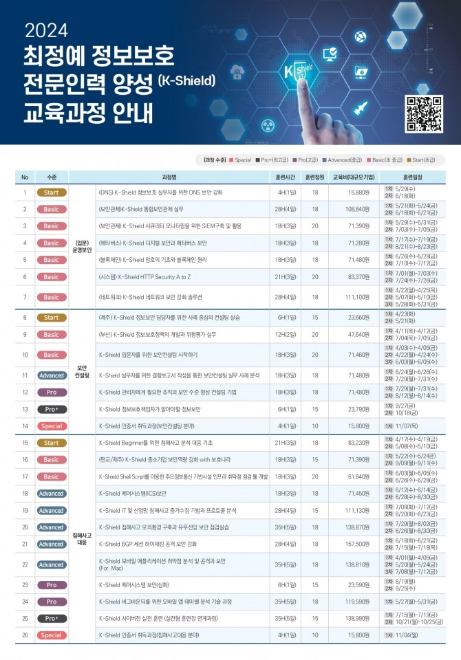 이미지 확대보기특히, K-Shield 인증서 취득을 위한 특화(K-Shield Special) 과정을 신설했다. 최종 인증서 평가를 통과하면 한국인터넷진흥원장이 인정하는 최정예 사이버보안 전문가(K-Shield) 인증서를 발급한다.