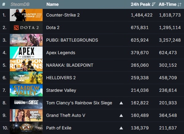 스타듀 밸리 위로 '카운터 스트라이크 2', '도타 2'나 크래프톤의 '펍지: 배틀그라운드' 등 톱6 게임은 순위 변동이 없었다. 특히 올 2월 8일 출시된 소니 인터랙티브 엔터테인먼트(소니IE)의 '헬다이버스 2'가 5위에 안착하는 모양새다.