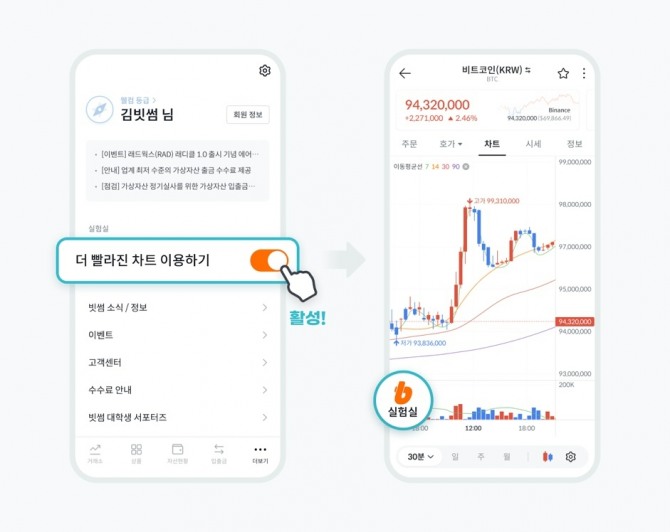 이미지 확대보기'더 빨라진 차트'도 새롭게 선보인다. '더 빨라진 차트' 기능을 사용하면 로딩 없이, 더 빠르고 유려한 모션의 시세 차트를 이용할 수 있다. 기존 웹뷰(Web View) 방식을 네이티브(Native)로 변경해 로딩 및 반응 속도를 4배 빠르게 개선했다. 더 빨라진 차트는 '빗썸 실험실'의 기능 활성화를 통해 이용 가능하다.