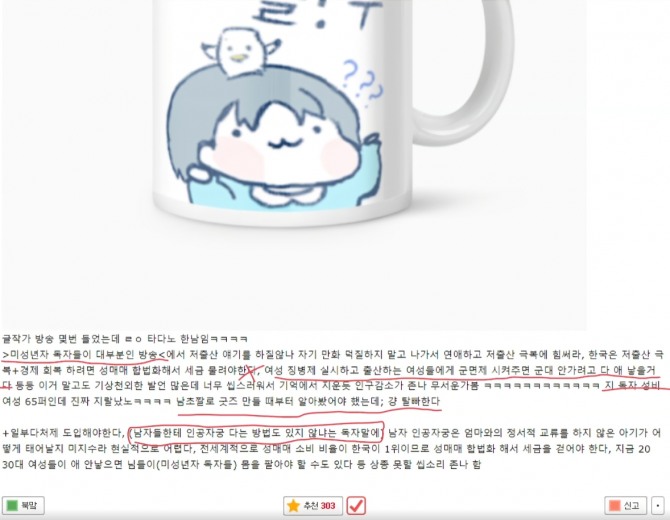 이미지 확대보기10일 관련업계에 따르면 지난 8일 온라인 커뮤니티에 익명의 누리꾼이 웹툰 작가 A씨가 방송에서 논란이 될 발언을 계속하고 있다며 글을 올렸다. 해당 글에서는 A씨가 "성매매 합법화 해서 세금 물려야 한다", "여성 징병제 실시 후 출산 시 군 면제 시켜주면 다 애 낳을 거다" 등의 발언을 했다는 주장이 실렸다.