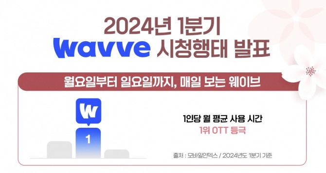 이미지 확대보기웨이브(Wavve)가 2024년 1분기 누적 시청 데이터(2024.01.01~2023.03.31)를 바탕으로 결산 리포트를 15일 발표했다. 웨이브는 1분기 전 장르에서 시청 시간 순증 추세가 확인됐다. 또한 데이터분석플랫폼 모바일인덱스에 따르면 OTT 앱 중 웨이브가 1인당 평균 사용시간이 가장 높은 OTT로 나타났다.