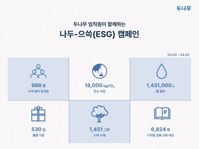 두나무의 나두-으쓱 캠페인은 일상 속 탄소 중립·사회 공헌 실천 문화 정착 및 ESG 가치 확산을 위해 기획됐다. 그간 임직원 물품·지식 재능 기부, 나무 심기 봉사, 계단 오르기 챌린지 등 6개의 다양한 프로그램들이 운영됐으며, 마일리지 제도를 통해 매 순간 모두 즐겁게 참여할 수 있도록 독려했다. 현재까지 캠페인 누적 참여 임직원 수는 총 986명에 달한다.