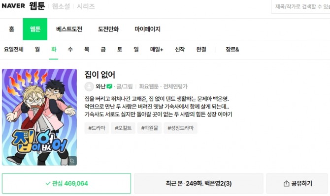 이미지 확대보기네이버 웹툰에서 와난 작가가 연재 중인 '집이 없어' 또한 각자의 이유로 불행하고 위태로운 가정의 모습을 담았다. 주인공 고해준과 백은영을 중심으로, 부모와 가족으로부터 비롯된 트라우마를 마주하고 그를 조금씩 극복해나가는 인물들의 이야기를 다룬다.
